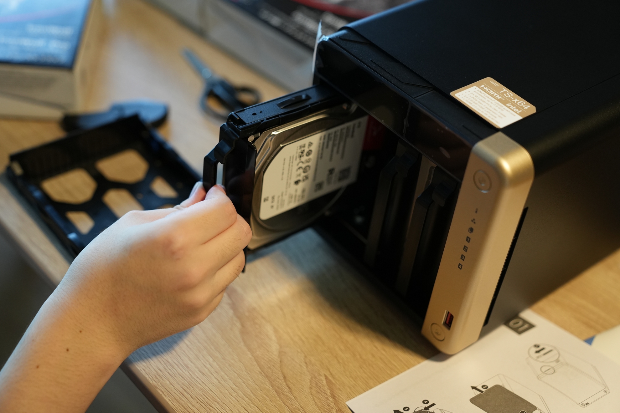 さて開封が終わったのでいよいよHDDをケースにネジ止めしていきます。自他ともに認める不器用な男の挑戦です。