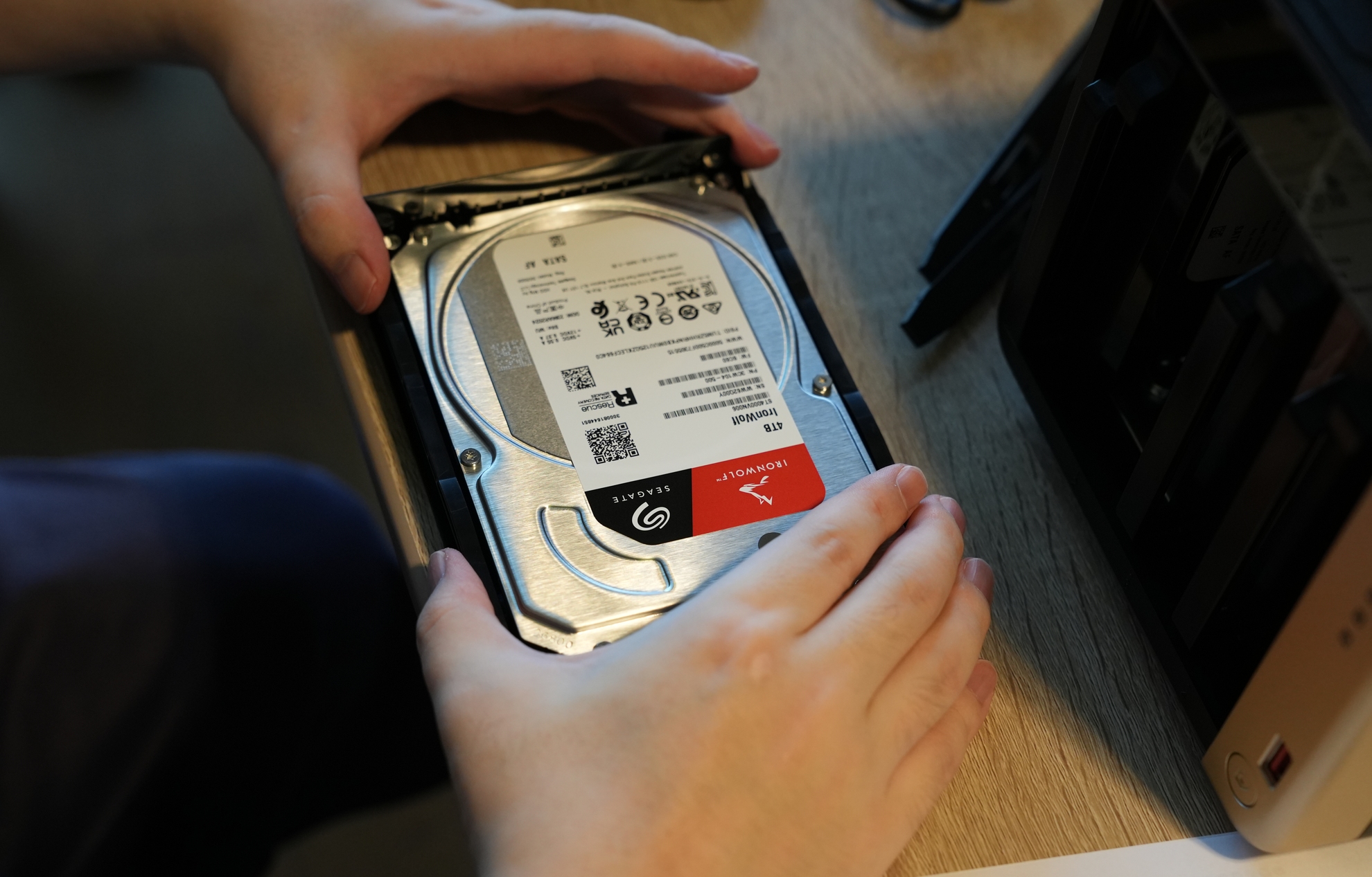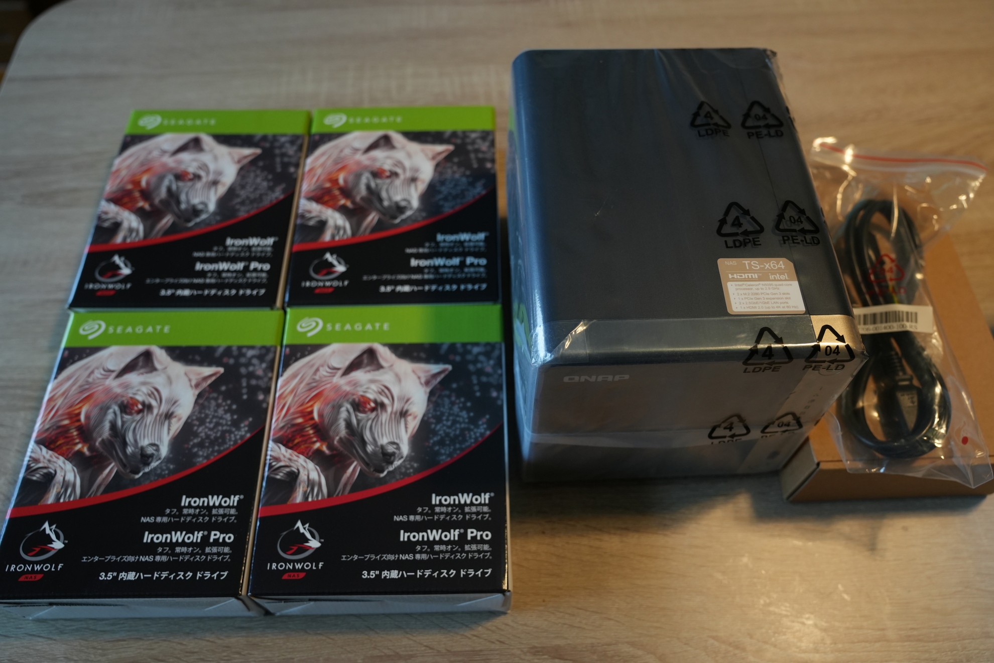 開封! ©Toshishige Maemki箱を開けるとNAS本体・付属品とNAS用のハードディスク。ハードディスクは「Seagate IronWolf」の4TB×4の16TB分。NAS用のハードディスクの中では、比較的若干ですが安かったのでこれにしました。今後大事なデータを守って頂くので予算掛けたかったのですが、そこまでお金掛けられなかったので頼むぞという気持ちです…(笑)。