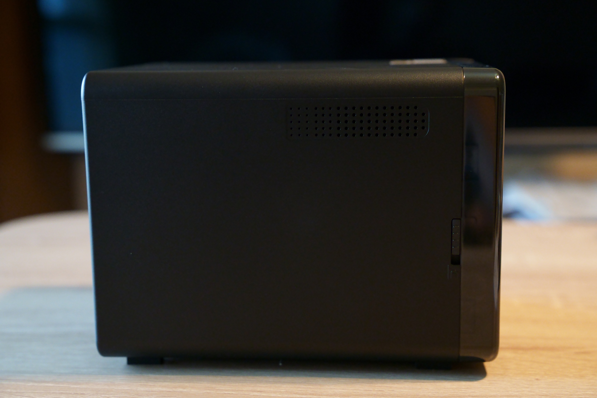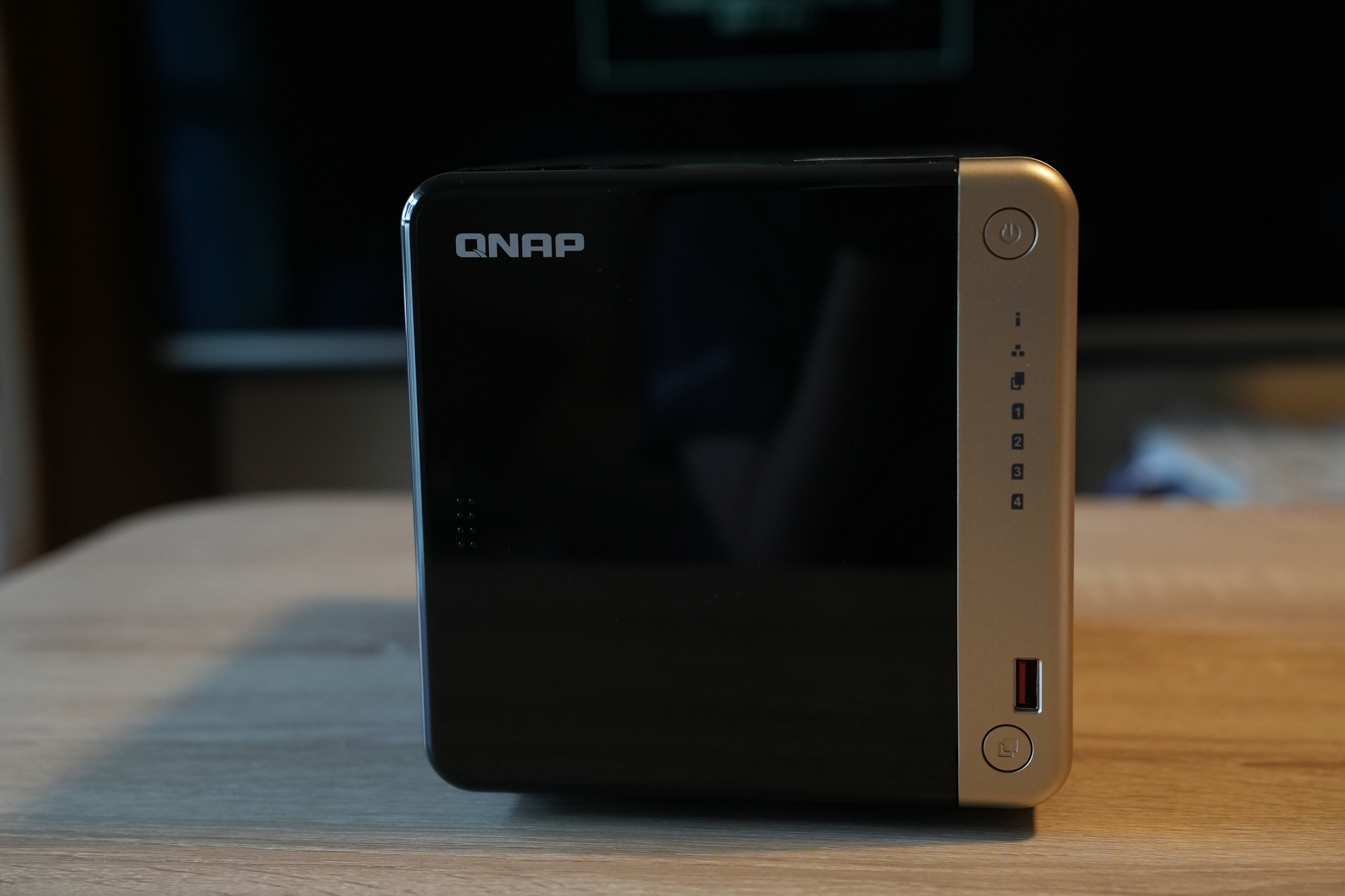 NASの正面、見た目がスタイリッシュ! ©Toshishige Maemki正面はこんな感じでカバーが着いている状態です。ブラックとゴールドの色合いはとてもよく合っていて、スタイリッシュだと思います。前面右側にはUSB3.2Genポート、USBの下にあるボタンは「USBコピーボタン」らしい。USBで外部デバイスと接続してこのボタンを押せばインポートやコピー、同期等ができるらしい(※要設定、外部ストレージはコピーボタンを押してもコピーされない)