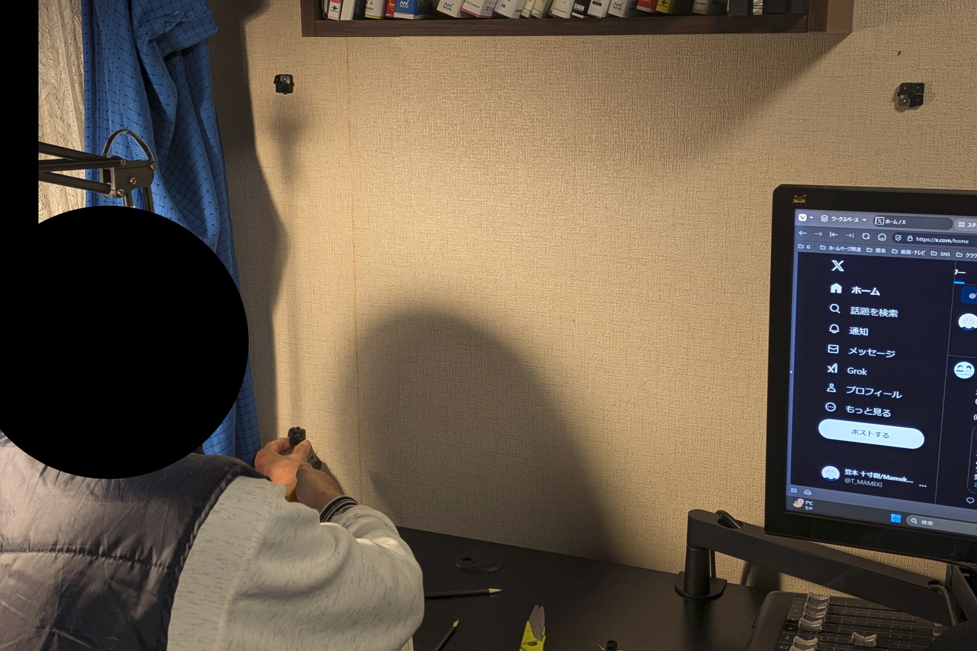 そして写真のようにその印に留め具を4か所取り付け。その上から有孔ボードの穴をあてがって、留め具の穴にビスで締めていきました。